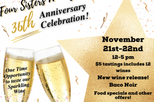 New wine release: Baco Noir! One-time opportuniy to taste FSW's sparkling wine. $5 tasting includes 12 wines, plus other specials.
