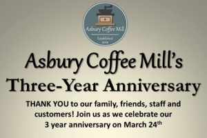 Asbury Coffee is celebrating their 3 year anniversary and wants you to celebrate with them! Music performed by Sydney Atkinson. Enter a raffle to win a prize!