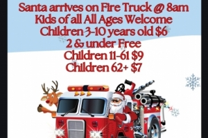 Santa will arrive on the firetruck at 8am! Adults: $9; kids: $6; seniors: $7. Children age 2 and younger are free. Pay upon arrival.
