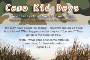You may have heard the saying - "Children should be seen and not heard." What happens when they can't be seen? They get into the maze for free! The maze is open Wednesday through Sunday each week, but each Wednesday through Nov. 6, children ages 4-12 wearing camo clothes get into the maze for free! The military-themed corn maze this year pays tribute to the Huey helicopter.