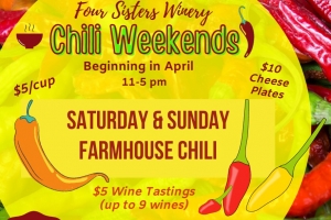 Are you feeling spicy? Four Sisters is cooking up chili every weekend in April. This week's specialty chili is our homemade Farmhouse recipe. A fresh and zesty red beef chili with beans, fresh herbs, and peppers. Pair this chili with a glass of wine while you sit on the deck enjoying a beautiful spring day.