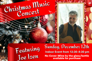 Four Sisters Winery is hosting a very special Christmas Music Concert featuring the very talented Joe Izen. Enjoy wine tasting ($5), wines by the glass, bottle, and some festive appetizers and food specials (all available for purchase). Admission is free of charge.
