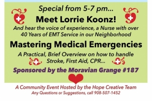 The Hope Creative Team encourages you spend the evening in the village to shop, support local eateries, and then bring your takeout to the Community Center to relax, play card/board games, make crafts, share local news, and have some hot chocolate and tea! Join friends an neighbors doing any/all of these things 4-7pm, and check out a presentation from an experienced nurse, "Mastering Medical Emergencies" from 5-7pm.