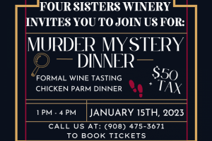 This thrillingly epic event, Murder Mystery Dinner at Four Sisters Winery, will be one that you won't want to miss! Our interactive Murder Mystery Dinner is non-stop amusement from beginning to end. Can you identify the perpetrator? You, your friends, and fellow gumshoes will enjoy equally hilarious and mystifying entertainment. So, take delight where you play a detective to solve this perplexing crime.