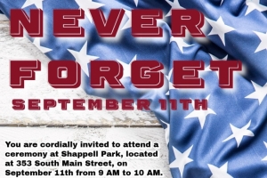 The public is invited to commemorate the events of 9/11/2001 by coming together for a ceremony to stand together in solidarity to remember, reflect and reaffirm a commitment to unity and resilience in the face of adversity. Music and refreshments will be provided.
