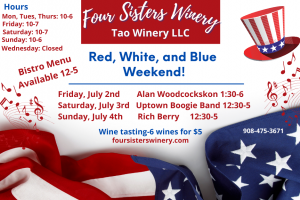 Enjoy the holiday weekend at Four Sisters Winery. Live music Friday, Saturday and Sunday; wine tasting ($5), savor wine by the glass or bottle, Vineyard View Bistro Menu available.