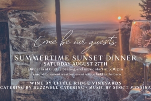 Enjoy dinner with live music as the sun sets over the mountain ridge, vineyards and farm. Wine by Little Ridge Vineyards, Buzzwell Catering and live music by Scott Messina.