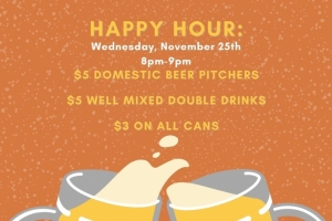 Thanksgiving Eve Happy Hour, 8pm-9pm. Draught House will be open inside until 10pm, and check out the Draught House Igloo 8pm-2am!