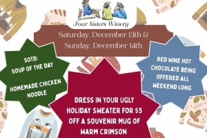 Show up to Four Sisters Winery in your "ugly" holiday sweater for $5 off a souvenir mug of Warm Crimson! The winery will also be serving Red Wine Hot Chocolate as a special and homemade chicken noodle soup all weekend.