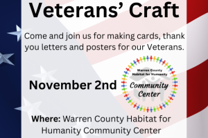 Join in an activity that includes preparing cards, letters and posters to be sent to veterans. Please RSVP to annette.beam@warrenhabitat.org.