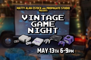 Throw back to a simpler time with Matty Alan Estock and his vintage video game setup. Consoles include an NES, SNES, N64, and GameCube with the games available to play!
