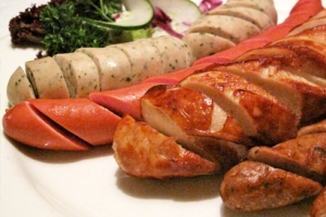 Liverwurst, Smoked Salmon, Deviled Eggs, Smoked Pork Chops, Sauerkraut, Sauerbraten, Red Cabbage, Potato Dumplings, Bratwurst, and Potato Salad