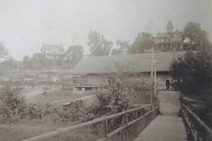 (PHOTO: The Footbridge circa 1900 shows the Footbridge in the foreground with the NYS&W Blairstown Station and Howell Lumberyard to the left. Photo courtesy of Blairstown Historic Presevation Committee.)