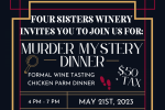 This thrillingly epic event, Murder Mystery Dinner at Four Sisters Winery, will be one that you won't want to miss! This is an interactive dinner where you'll help solve the crime! It starts with a formal wine tasting, followed by a plated dinner of Chicken Parmesan, salad, roasted vegetables, bread, and dessert.