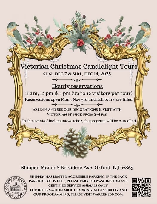 Shippen Manor continues to celebrate Warren County's Bicentennial with Victorian Candlelight tours. Registration is now open. Please contact Gina by email or call the office 908- 453-4381 during office hours for more information.