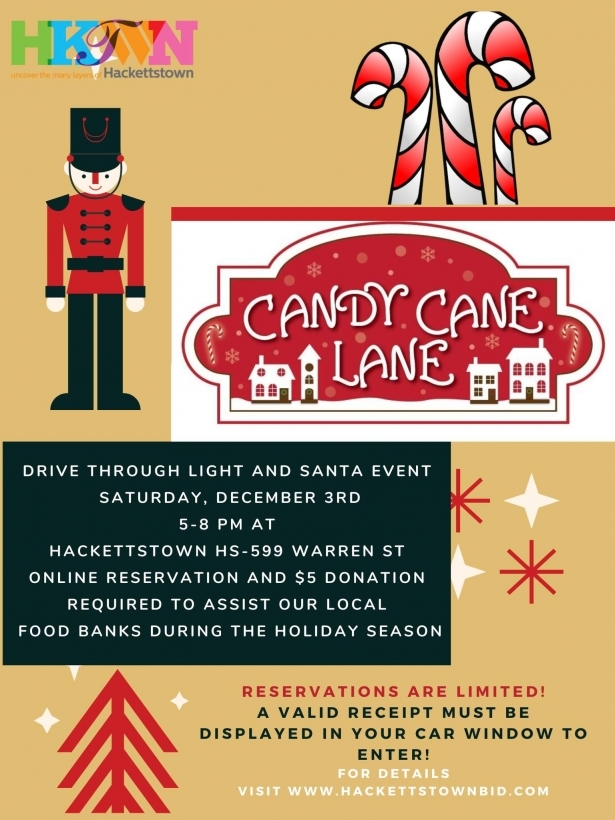 Sure to put you in the holiday spirit, Hackettstown BID is bringing back Candy Cane Lane at Hackettstown High School. Santa and one of his elves will hand all cars a goody bag at the end. Reservations are required so sign up today!
