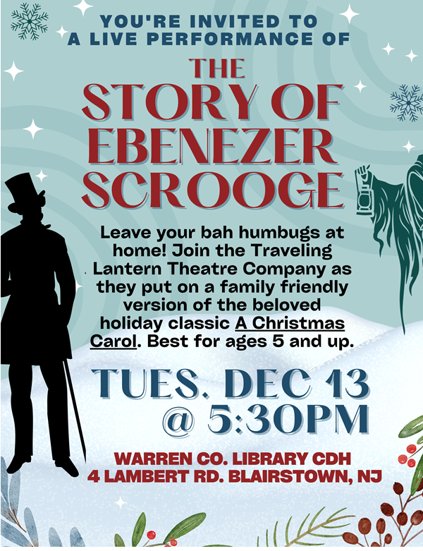 Enjoy a live performance by the Traveling Lantern Company of 'A Christmas Carol" depicting Ebenezer Scrooge, a nasty, mean, snarling old geezer with no care for anything other than his money. A visit from an old friend melts his heart of ice just in time for Christmas. Registration is required.