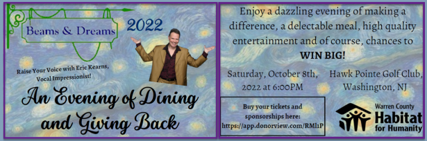 Habitat for Humanity's annual Beams and Dreams Fundraiser offers a gourmet buffet, outstanding entertainment and live and silent auctions; and features vocal impressionist Eric Kearns, the star of “Voices of Legends.” $100 per ticket, discounts available for pairs and groups. A wonderful evening of entertainment, dining and giving back!