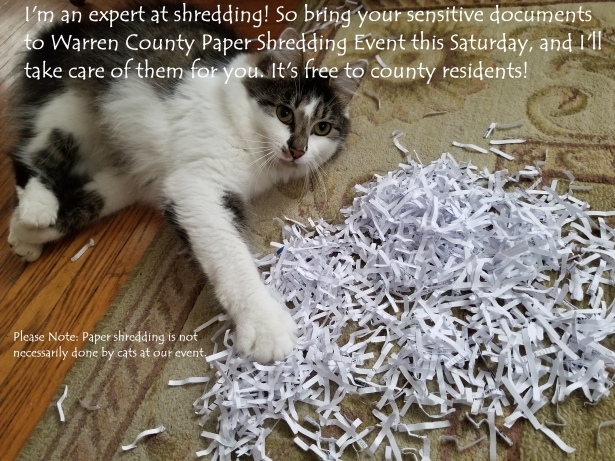 Warren County's semiannual Paper Shredding event is a free service to Warren County residents (not for businesses, and proof of residency required). Bring your confidential/sensitive paper materials; any document that contains personal exclusive information. Please limit the quantity to 4 bags or boxes weighing no more than 20 lbs. each. Staff will be available to unload documents.
